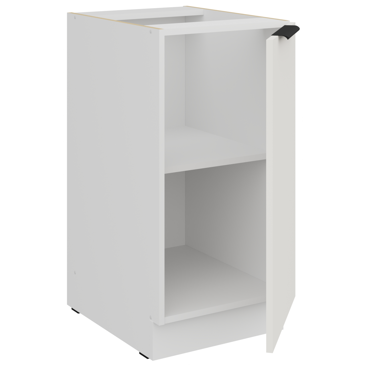 Cabinet interior in white colour. The cabinet is equipped with one shelf. Handle holes are drilled as blind holes (not through). |