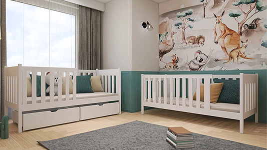 Are you arranging a room for siblings? A bunk bed is the perfect solution – especially if you have a small room. In our offer you will find fancy models that are a decoration in themselves. One of the proposals is the ALVA bunk bed with two drawers for bedding and mattress frames made of pine boards. The safety rail can be placed on the left or right side. The bed is available in several sizes, which makes it easier to choose furniture for the current needs and age of the children. The white model looks extremely light – it will not overwhelm the arrangement. It will provide the little ones with comfortable conditions for a night's rest.