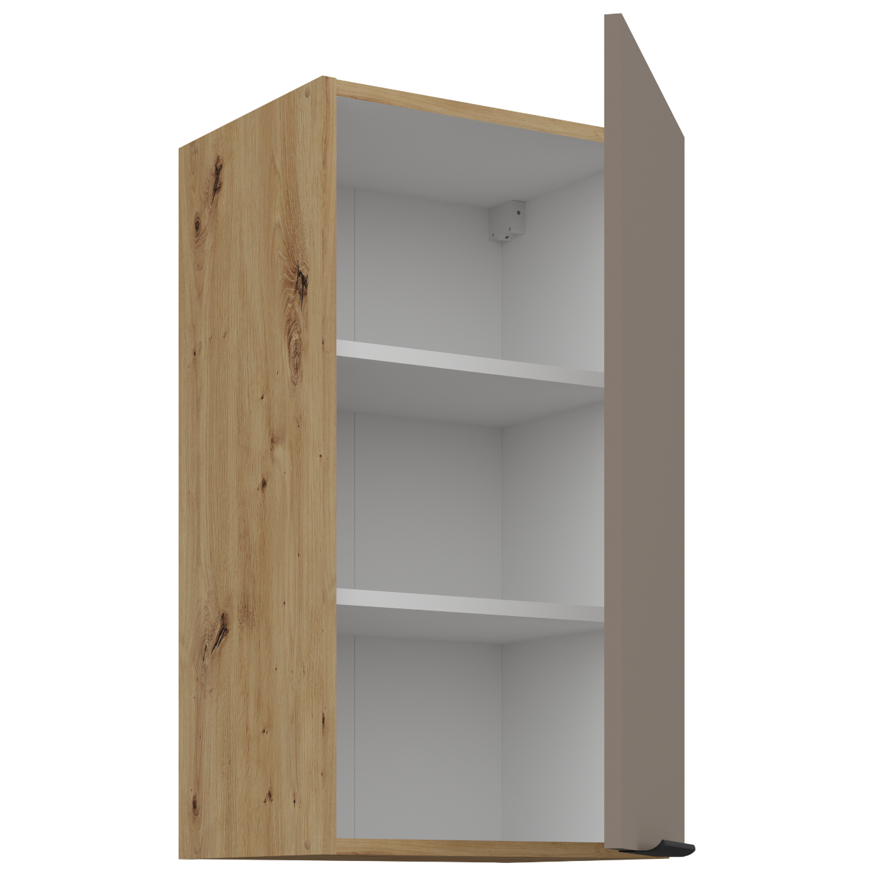 Cabinet interior in white colour. The cabinet is equipped with two shelves. Handle holes are drilled as blind holes (not through). |