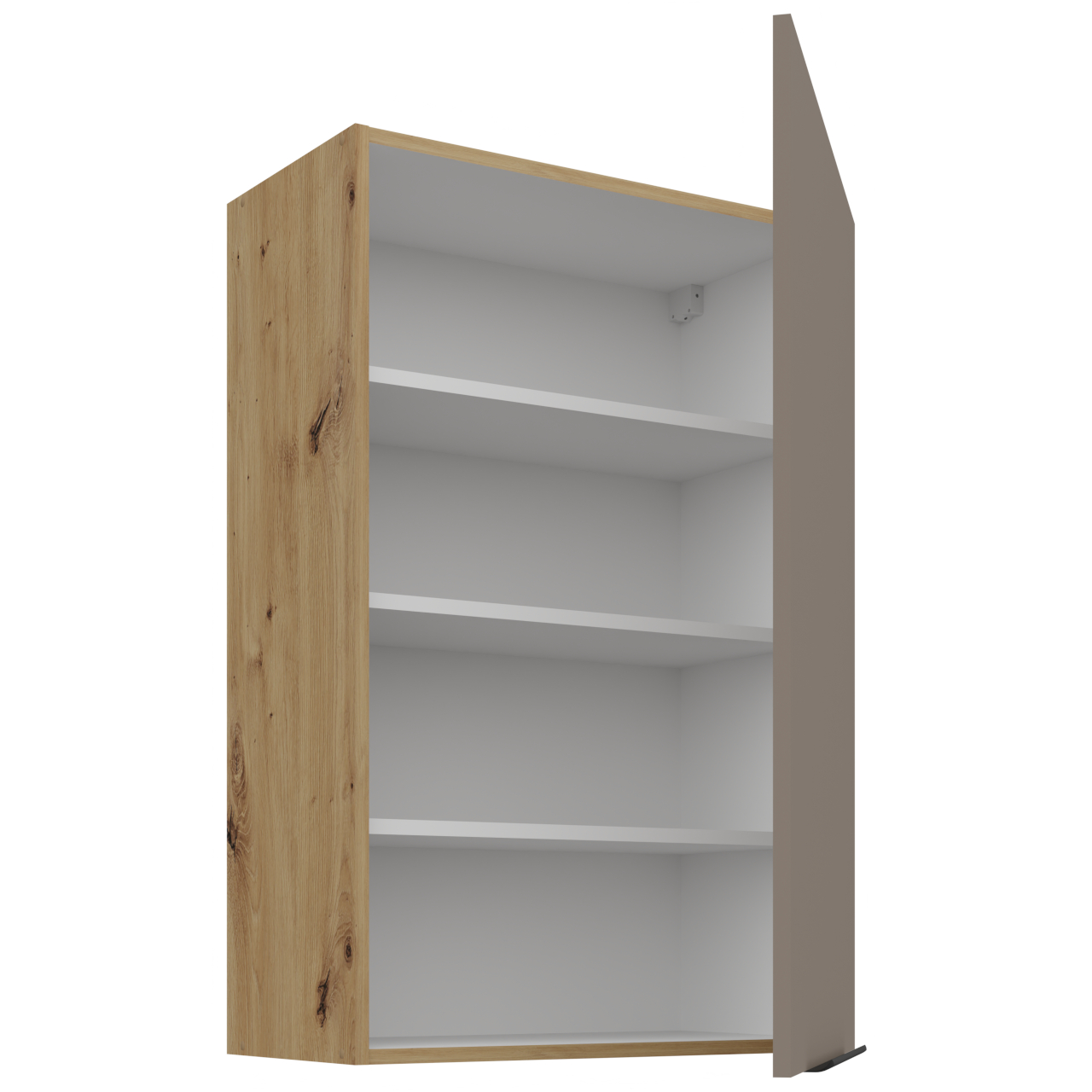Cabinet interior in white colour. The cabinet is equipped with three shelves. Handle holes are drilled as blind holes (not through). |